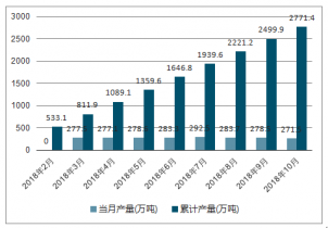 2018年2-10月中國(guó)原鋁(電解鋁)各月當(dāng)月產(chǎn)量及累計(jì)產(chǎn)量走勢(shì)