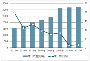 2010-2017年中國(guó)原鋁(電解鋁)產(chǎn)量及同比增長(zhǎng)走勢(shì)