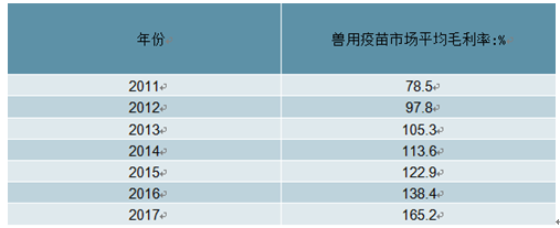 2011-2017年中國(guó)獸用疫苗獸用疫苗市場(chǎng)平均毛利率走勢(shì)