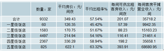 全國(guó)星級(jí)飯店第二季度平均房?jī)r(jià)為349.43元/間夜,同比增長(zhǎng)4.78%;平均出租率為57.54%,同比增長(zhǎng)2.41%;每間可供出租客房收入為201.07元/間夜,同比增長(zhǎng)7.30%;每間客房平攤營(yíng)業(yè)收入為35718.20元/間,同比增長(zhǎng)7.91%。
