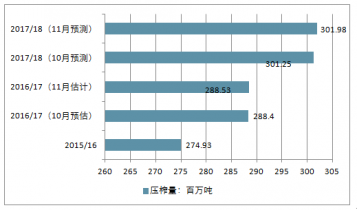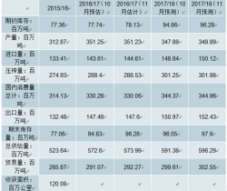 2017 年 11 月 10 日國內(nèi)大豆現(xiàn)貨平均價(jià)為 3603.68 元/噸,美國、阿根廷和巴西的完稅到岸價(jià)均價(jià)為 3293.00 元/噸,當(dāng)前價(jià)差為 310.68 元/噸。數(shù)據(jù)顯示,農(nóng)業(yè)部本月對 17/18 年度大豆進(jìn)口量預(yù)測值提升至 9597 萬噸,較上月的預(yù)測值提高 147 萬噸,同時國內(nèi)消費(fèi)量由 10921 萬噸提升至 11056 萬噸,結(jié)余變化的預(yù)測值由 1 萬噸提升至 8 萬噸,預(yù)計(jì)未來一年內(nèi)國內(nèi)大豆供需寬松,價(jià)格承壓。從大豆壓榨加工企業(yè)的角度來看,加工原料主要依靠進(jìn)口大豆,國際豆價(jià)是影響國內(nèi)加工企業(yè)經(jīng)營成本的最直接因素。國際大豆方面,預(yù)計(jì)國際大豆價(jià)格仍將趨勢向下。
