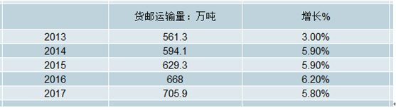 2013-2017年全國(guó)民航貨郵運(yùn)輸及增長(zhǎng)情況