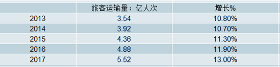 2017年全年完成旅客運(yùn)輸量5.52億人次,比上年增長(zhǎng)13.0%,旅客周轉(zhuǎn)量9512.78億人公里,增長(zhǎng)13.5%。