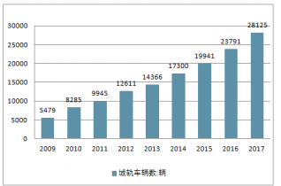 我國城軌車輛數(shù)持續(xù)高速增長,從 2009 年的 5479 輛增長至 2017 年的 28125 輛,GAGR22.69%。隨著城軌在建和規(guī)劃線路逐年增長,車輛與裝備企業(yè)將充分受益。