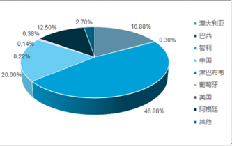 2017年全球鋰礦儲量約1600萬噸。其中智利儲量高達750萬噸,占全球總儲量的51.8%。此外,中國(320萬噸,20.00%)、阿根廷(200萬噸,12.5%)、澳大利亞(270萬噸,16.88%)等國儲量也較豐富。