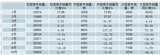2018年1-10月全國客車細分類別銷量量增長對比