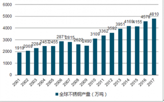 2016年全球不銹鋼產(chǎn)量4578萬噸,較2015年的4155萬噸增長10.18%。2017年全球不銹鋼產(chǎn)量為4810萬噸,較上年增長5.8%。