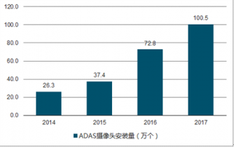從目前我國ADAS系統(tǒng)中攝像頭應(yīng)用情況來看,攝像頭產(chǎn)品主要用于前視或后視領(lǐng)域,環(huán)視、側(cè)視、內(nèi)置攝像頭在我國汽車產(chǎn)業(yè)中滲透水平依舊較低。2017年我國ADAS攝像頭安裝總量為100.5萬個。