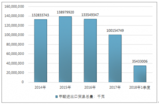 2016年我國甲酸進出口貿(mào)易總量133549347千克,2017年進出口貿(mào)易總量100154749千克;2019年1季度進出口貿(mào)易總量35433006千克。