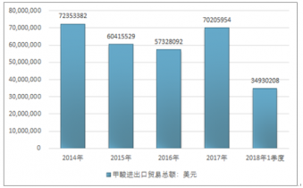 2016年我國甲酸進出口貿(mào)易總額57328092美元,2017年進出口貿(mào)易總額70205954美元;2019年1季度進出口貿(mào)易總額34930208美元。