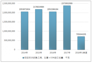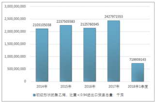 2016年我國初級形狀的聚乙烯,比重<0.94進出口貿(mào)易總量2125760345千克,2017年進出口貿(mào)易總量2427971553千克;2019年1季度進出口貿(mào)易總量719939143千克。