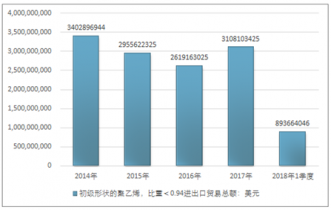 2016年我國初級形狀的聚乙烯,比重<0.94進出口貿(mào)易總額2619163025美元,2017年進出口貿(mào)易總額3108103425美元;2019年1季度進出口貿(mào)易總額893664046美元。