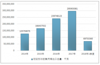 2016年我國初級(jí)形狀的聚丙烯出口總量239748123千克,2017年出口總量295903081千克;2019年1季度出口總量69753360千克。