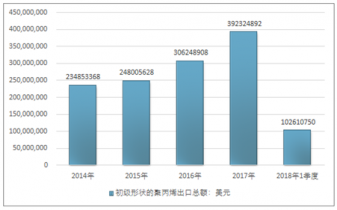 2016年我國初級(jí)形狀的聚丙烯出口總額306248908美元,2017年出口總額392324892美元;2019年1季度出口總額102610750美元。
