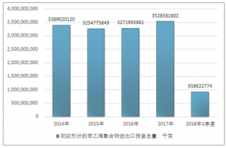 2016年我國初級形狀的苯乙烯聚合物進(jìn)出口貿(mào)易總量3271993981千克,2017年進(jìn)出口貿(mào)易總量3528581602千克;2019年1季度進(jìn)出口貿(mào)易總量918622774千克。