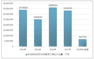 2016年我國改性的初級形狀的聚苯乙烯出口總量35980294千克,2017年出口總量33190792千克;2019年1季度出口總量6617542千克。