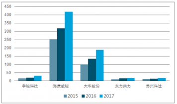宇視科技、海康威視、大華股份、東方網(wǎng)力、蘇州科達(dá)2015-2017年?duì)I收對(duì)比(單位:億元)