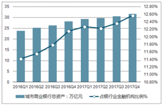 2016-2017年城市商業(yè)銀行總資產(chǎn)季度變化及占比走勢