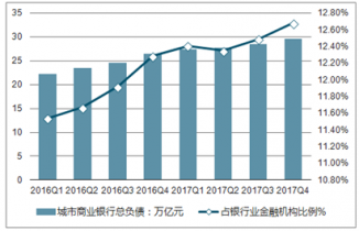 2016-2017年城市商業(yè)銀行總負(fù)債季度變化及占比走勢