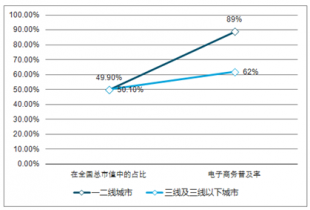 2016 年三線及更低線城市的電商零售額占比 50.1%,首次超過一二線城市的電商零售額占比 49.9%,成為我國最大電商市場。2016 年三線及更低線城市的電商普及率雖然只有 62%低于一二線城市的 89%,但是由于我國幅員遼闊,廣大的三線及更低線城市基數(shù)更大,有的 2.57 億網(wǎng)購者數(shù)量遠高于一二線城市的 1.83億。三線及更低線城市的網(wǎng)購者增速 61%也高于一二線城市的網(wǎng)購者增速 43%,高出 18 個百分點。