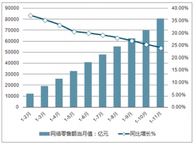 2019年1月份,網(wǎng)絡(luò)零售總額80689億元,同比增長24.10%。2019年1-11月份網(wǎng)絡(luò)零售總額80689億元,同比增長24.10%。