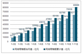 2019年1月份,網(wǎng)絡(luò)零售總額80689億元,同比增長24.10%。2019年1-11月份網(wǎng)絡(luò)零售總額80689億元,同比增長24.10%。