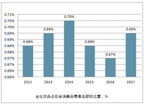 作為社會(huì)消費(fèi)品中一個(gè)細(xì)分產(chǎn)品,化妝品零售總額所占的比重波動(dòng)變化。2017年全年社會(huì)消費(fèi)品零售總額366262億元,比上年增長(zhǎng)10.2%。2012-2017年間,化妝品零售總額占社會(huì)消費(fèi)零售總額的規(guī)模始終在1%以下,以2014年的占比最高達(dá)到0.70%,2016年零售額占比最低,下降至0.67%,2017年該比例增加至0.69%。