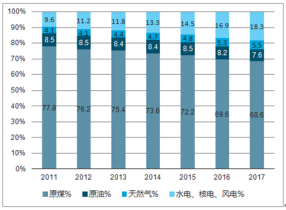 2017年能源生產(chǎn)結構中,原煤占比68.6%,原油占比7.6%,天然氣占比5.5%,水電、核電、風電等占比18.3%。