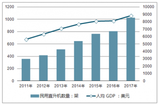 2011-2017年中國(guó)人均 GDP 與民用直升機(jī)數(shù)量
