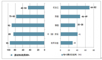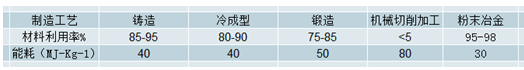 粉末冶金具有節(jié)材節(jié)能、可大批量制造復(fù)雜零部件等優(yōu)勢。粉末冶金生產(chǎn)的零件接近最終尺寸,一次成型,不用或少用切削加工,因此材料利用率高達97%以上,而機加工材料利用率僅為50%左右。由于粉末冶金工藝省去了多道工序以及加工溫度的下降,塑造模具之后可以快速重復(fù)制造,因此可以批量制造復(fù)雜結(jié)構(gòu)件。正因粉末冶金的種種特性,尤其適合在汽車、家電領(lǐng)域內(nèi)大范圍應(yīng)用,制造尺寸小但結(jié)構(gòu)復(fù)雜的零部件。和其他制造工藝相比,粉末冶金的材料利用率和能耗均為最優(yōu):