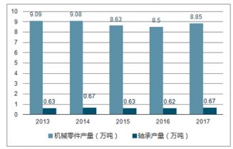 2017年日本粉末冶金產(chǎn)量達(dá)9.52萬(wàn)噸,同比上升4.27%,為1956年產(chǎn)量的87倍。其中機(jī)械零件產(chǎn)量為8.85萬(wàn)噸,同比上升4.12%;軸承產(chǎn)量為0.67萬(wàn)噸,同比上升8.06%。
