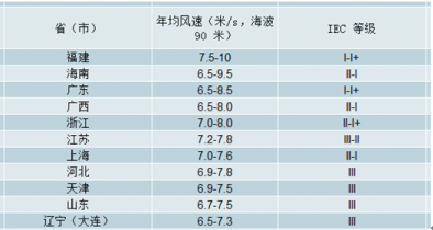 臺灣海峽海平面90米高度區(qū)域平均風速介于7.5-10米/s,部分地區(qū)年均風速超過10米/s,風場基本以IECI類或I+為主,具備極佳的開發(fā)價值。而沿臺灣海峽往北的浙江、上海、江蘇地區(qū)海域,海平面90米高度平均風速降至7-8米/s之間,浙江以及上海地區(qū)海上風場大多屬于IECII至I+類風場,而再向北部的江蘇海域大多屬于IECIII或II類。而從臺灣海峽向南的廣東、廣西區(qū)域,海平面90米高度年平均風速降至6.5-8.5米/s,這些區(qū)域海上風電場大多屬于IECI+類或II類。位于環(huán)渤海和黃海北部的遼寧、河北海域,海平面90米高度年平均風速基本介于6.5-8米/s之間,該區(qū)域的海上風電場大多屬于IECIII類