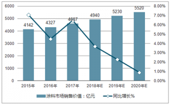 2019年中國涂料市場銷售價值將近5000億元,到2020年,涂料銷售價值將超5500億元。