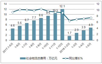 2017-2018年中國社會物流總費用及同比增長走勢