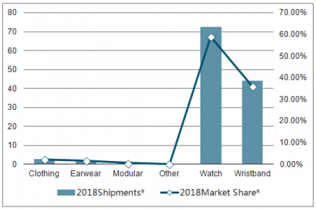 2018年世界范圍內的可穿戴產(chǎn)品預測(數(shù)以百萬計的出貨量)