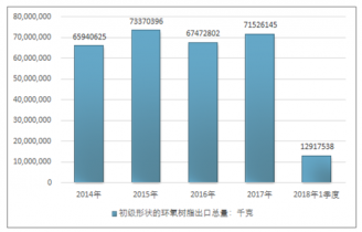 2016年我國(guó)初級(jí)形狀的環(huán)氧樹脂出口總量67472802千克,2017年出口總量71526145千克;2018年1季度出口總量12917538千克。