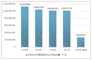 2016年我國初級形狀的聚酰胺進出口貿易總量1003548740千克,2017年進出口貿易總量1006757120千克;2018年1季度進出口貿易總量265926040千克。