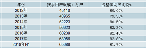 2012-2018年上半年中國(guó)搜索用戶規(guī)模及占比走勢(shì)