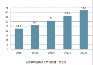 當(dāng)前,人類社會正處于金融創(chuàng)新的活躍期,加之互聯(lián)網(wǎng)向各個行業(yè)不斷沖擊滲透, 預(yù)計2019年我國互聯(lián)網(wǎng)金融行業(yè)市場規(guī)模將達(dá)到22.3萬億元,未來五年(2018-2022)年均復(fù)合增長率約為17.36%,預(yù)計到了2022年我國互聯(lián)網(wǎng)金融行業(yè)市場規(guī)模將達(dá)到42.3萬億元。