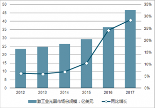 2012-2017年全球激工業光器市場份規模及增速(單位:億美元)