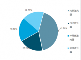 2017年工業激光器的高速增長,主要得益于光纖激光器的大幅增長。光纖激光技術不斷取得突破,行業下游需求穩步增長,光纖激光器行業市場規模超過20億美元,在全球工業激光器市場中占比達到42.7%。CO2激光器、半導體激光器和固體激光器市場占比分別為20.2%、19.5%、18%。