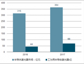 2017 年半導體激光器市場 360 億元左右,占整體激光器市場的 50%,半導體激光器增速 15%左右。
