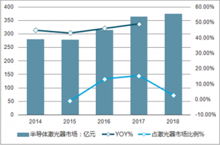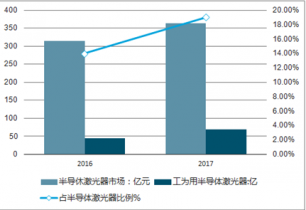 2017 年半導體激光器市場 360 億元左右,占整體激光器市場的 50%,半導體激光器增速 15%左右。