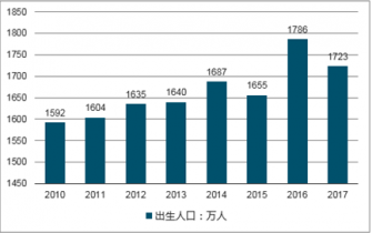 根據(jù)國家統(tǒng)計局的統(tǒng)計數(shù)據(jù)顯示,2010-2017年間,我國新生嬰兒數(shù)量總體上保持逐年增長的趨勢,2017年我國新生嬰兒數(shù)量為1723萬人,人口出生率為12.43‰。