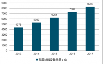 2017年底我國(guó)磁共振成像(MRI)設(shè)備保有量為8289臺(tái)(不含軍隊(duì)),相比2016年的7307臺(tái)增長(zhǎng)了13.4%。