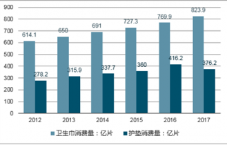 2012-2017年全國衛(wèi)生巾、護墊消費量走勢圖