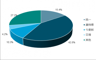 方便面食品行業(yè)作為國家鼓勵類發(fā)展行業(yè),行業(yè)初期的高速發(fā)展曾經(jīng)催生了近1200 家方便面食品企業(yè),經(jīng)過市場洗禮,市場份額開始向品牌知名度高、實力強、規(guī)模效益顯著的大企業(yè)集中。隨著行業(yè)逐步朝規(guī)模化方向發(fā)展,行業(yè)的集中度越來越高,其在市場上基本表現(xiàn)為全國一線品牌與區(qū)域性龍頭方便面食品企業(yè)共同發(fā)展的競爭格局。