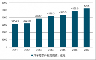 在經(jīng)濟(jì)水平不斷提高的大背景下,中國(guó)汽車(chē)產(chǎn)業(yè)得到了長(zhǎng)足的發(fā)展,催生了汽車(chē)零部件物流巨大的市場(chǎng)空間,在汽車(chē)工業(yè)的拉動(dòng)下,我國(guó)汽車(chē)零部件物流需求快速增長(zhǎng),規(guī)模從2011年的3134.5億元增長(zhǎng)到2017年的5225億元。