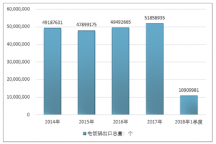 2016年我國電飯鍋出口總量49492665個,2017年出口總量51858935個;2018年1季度出口總量10909981個。