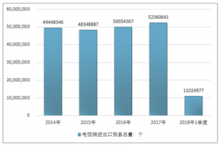 2016年我國電飯鍋進出口貿(mào)易總量50034367個,2017年進出口貿(mào)易總量52360641個;2018年1季度進出口貿(mào)易總量11024977個。